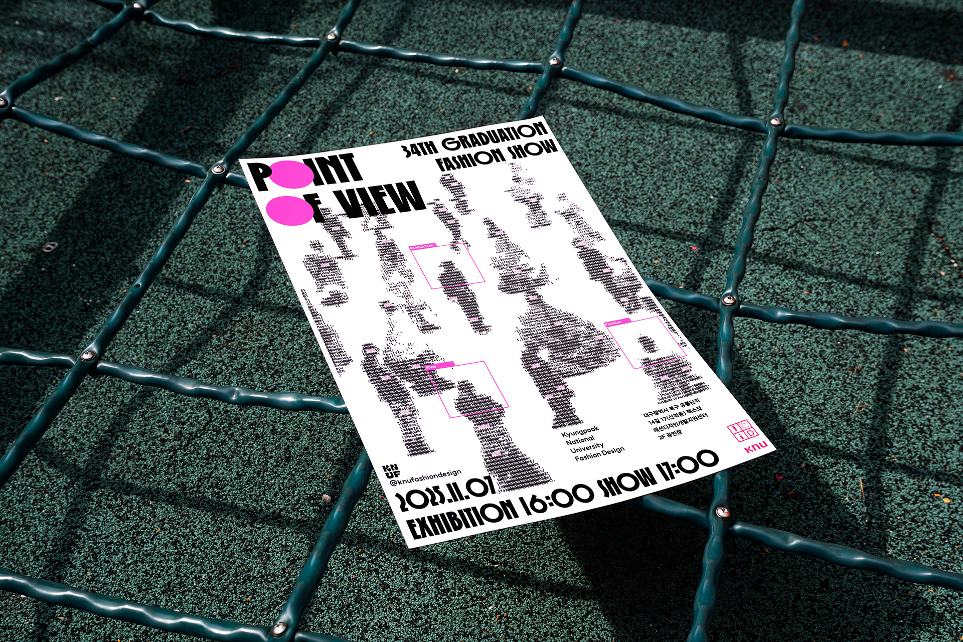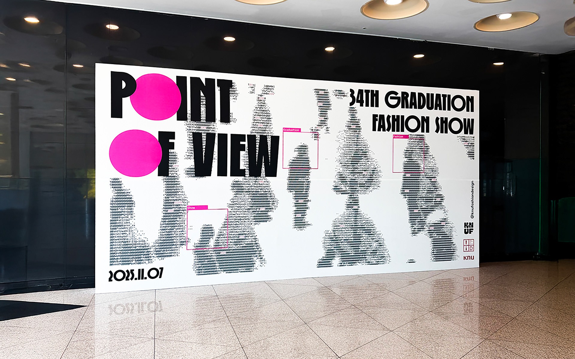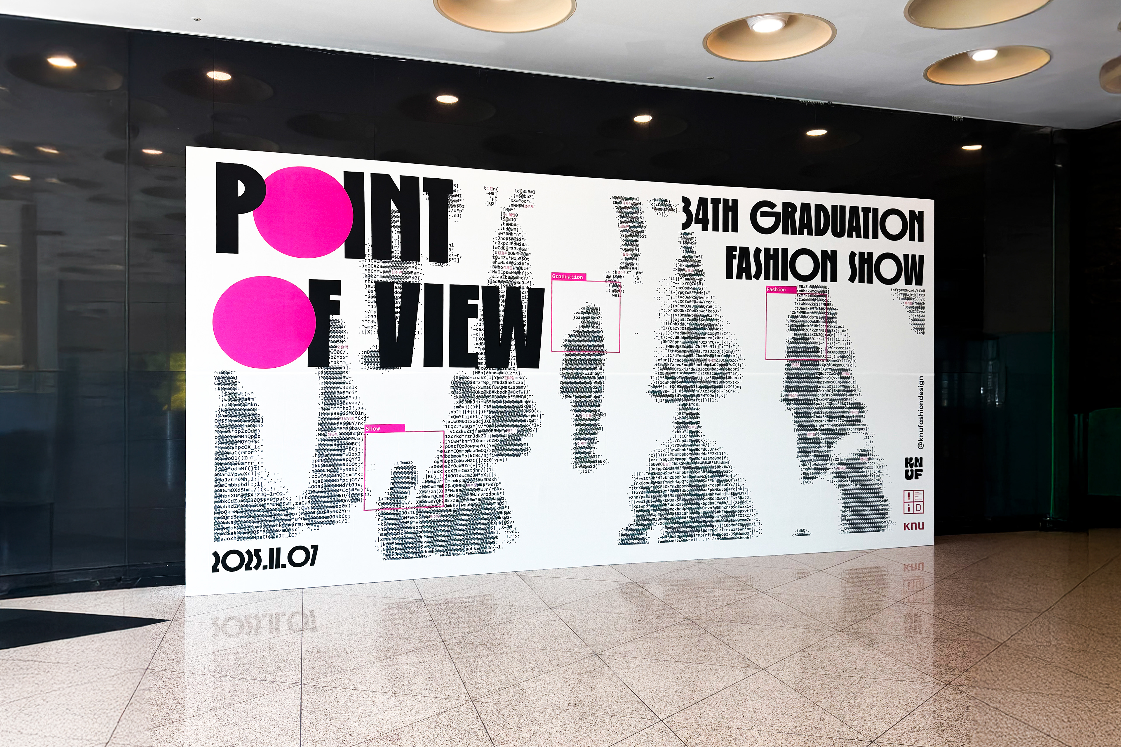 31인의 학생 디자이너의 개성과 그들만의 패션이라는 언어를 표현하고자 아스키 아트 방식을 사용했고, 시선이 닿는 Point를 강조하고자 형광 핑크 색상을 선택했으며,