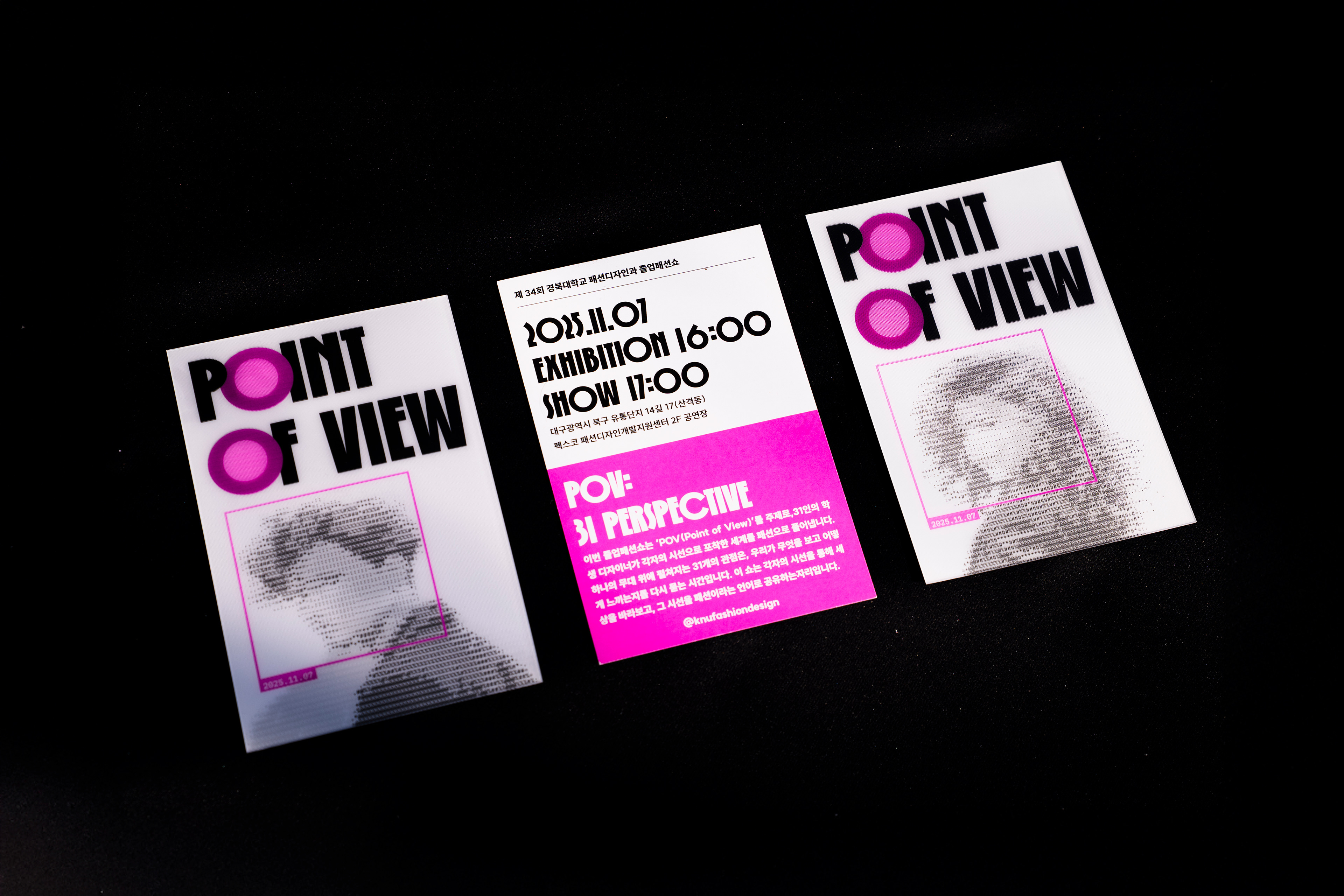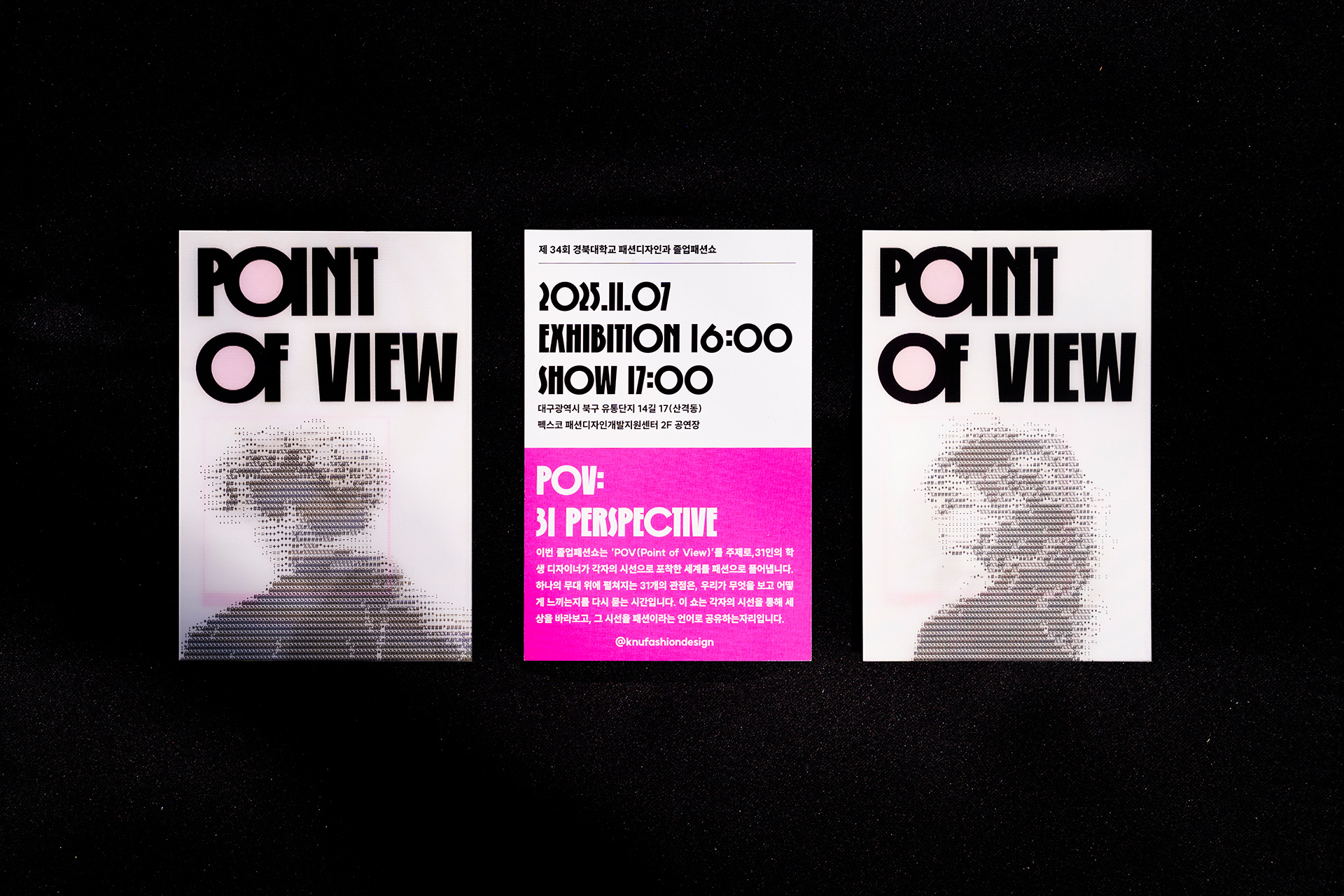 이번 졸업패션쇼는 ‘POV(Point of View)’를 주제로, 31인의 학생 디자이너가 각자의 시선으로 포착한 세계를 패션으로 풀어냅니다. 하나의 무대 위에 펼쳐지는 31개의 관점은,