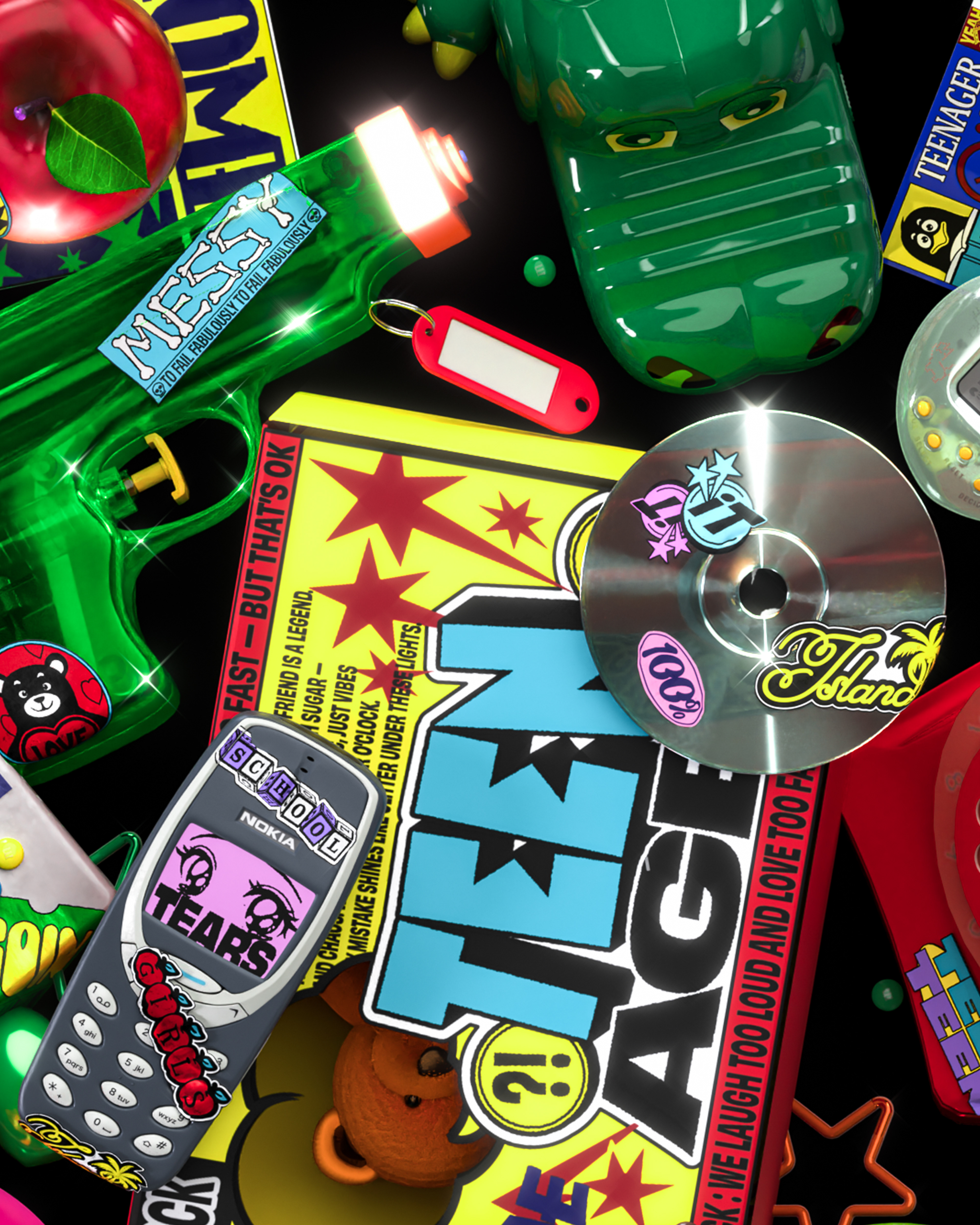 낙서, 로고, 태그, 주얼 장식 등 10대 문화의 요소들을 해체하고 재조합하여 복잡하면서도 본능적인 에너지를 담아내고자 했습니다. 특히 과잉된 그래픽과 불균형한 구성,
